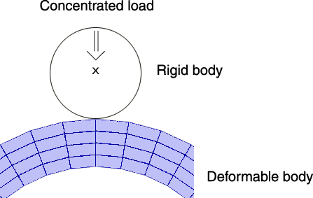 ![]() Contact at a single pointFigure 10 shows an example in which a circular rigid body is pushed into a deformable body. Figure 10. Example with two bodies initially touching at a single point.