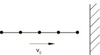 ![]() Energy considerations for hard kinematic contactThe kinematic contact algorithm strictly enforces contact constraints and conserves momentum. To achieve these qualities with a discretized model, some energy is absorbed upon impact. For example, consider a linear elastic beam modeled with several elements that impacts a rigid wall as shown in Figure 6. The kinetic energy of the leading node is absorbed by the contact algorithm upon impact. A stress wave passes through the truss, and the truss eventually rebounds from the wall. The kinetic energy after the rebound is smaller than before the impact because of the contact node's energy loss upon impact. As the mesh is refined, this energy loss is reduced because the mass and kinetic energy of the leading node of the truss become less significant. Figure 6. Beam impacting a fixed rigid wall.