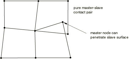 When using hard kinematic contact, it is still possible with the pure master-slave algorithm for the master surface to penetrate the slave surface in the corrected configuration (see Figure 1). Figure 1. Master surface penetrations into the slave surface of a pure