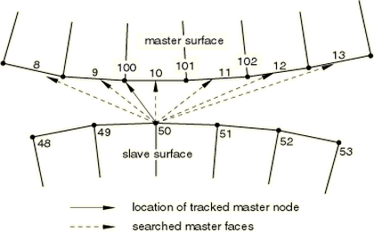 Contact tracking algorithmsA large portion of the computational cost associated with Abaqus/Explicit contact pairs derives from the algorithms used to track the relative motion between two contacting surfaces. There are two tracking approaches for the contact pair algorithm in Abaqus/Explicit, depending on the sliding formulation that is used: finite sliding and small/infinitesimal sliding. Finite-sliding trackingAbaqus/Explicit is designed to simulate highly nonlinear events or processes. Because it is possible for a node on one surface to contact any of the facets on the opposite surface, Abaqus/Explicit must use sophisticated search algorithms for tracking the motions of the surfaces. The contact search algorithm is designed to be robust, yet computationally efficient. This algorithm assumes that the incremental relative tangential motion between surfaces does not significantly exceed the dimensions of the master surface facets, but there is no limit to the overall relative motion between surfaces. It is rare for the incremental motion to exceed the facet size because of the small time increment used in explicit dynamic analyses. In cases involving relative surface velocities that exceed material wave speeds, it may be necessary to reduce the time increment. The contact search algorithm uses a global search at the beginning of each step, and a hierarchical global/local search algorithm is used for the other increments. The default contact search algorithm can handle the majority of typical contact situations. However, there are some situations that require special attention. We will consider a pure master-slave contact pair for discussion purposes. For a balanced master-slave contact pair, the contact search computations are performed twice for each contact pair. Global contact searchesA global search determines the globally nearest master surface facet for each slave node in a given contact pair. A bucket sorting algorithm is used to minimize the computational expense of these searches. A two-dimensional example, without consideration of “buckets,” is shown in Figure 9. Figure 9. Global search in two dimensions.