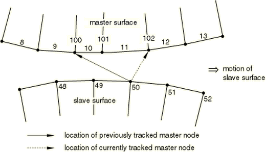 ![]() In the example shown in Figure 1 slave node 101 may come into contact anywhere along the master surface BSURF. While in contact, it is constrained to slide along BSURF, irrespective of the orientation and deformation of this surface. This behavior is possible because Abaqus/Explicit tracks the position of node 101 relative to the master surface BSURF as the bodies deform. Figure 2 shows the possible evolution of the contact between node 101 and its master surface BSURF. Node 101 is in contact with the element face with end nodes 201 and 202 at time . The load transfer at this time occurs between node 101 and nodes 201 and 202 only. Later on, at time , node 101 may find itself in contact with the element face with end nodes 501 and 502. Then the load transfer will occur between node 101 and nodes 501 and 502. Figure 2. Trajectory of node 101 in finite-sliding contact.