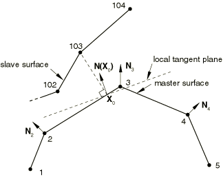 ![]() It shows the possible evolution of contact between slave node 101 in Figure 1 and its master surface BSURF. Using the unit normal vectors and , the anchor point was found for slave node 101; for the purposes of this example, assume that it lies at the midpoint of the 201–202 face. With this location of the local tangent plane for node 101 is parallel with the 201–202 face. The load transfer always occurs at the original anchor point between nodes 201 and 202, no matter how far node 101 has slid along the local tangent plane. Therefore, if node 101 moves as shown in Figure 7, it will continue to transmit load equally to nodes 201 and 202 when, in fact, it really slid off the mesh forming the master surface BSURF. What can be considered small slidingA contact pair in a small-sliding contact simulation should not grossly violate any of the assumptions or limitations outlined above. Adhere to the following guidelines: