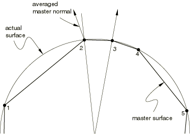 Master surface refinement in small-sliding problemsThe basic guidelines for pure master-slave contact given previously in this section should still be followed in a small-sliding simulation. However, in a small-sliding simulation more thought must be given to the degree of refinement for the master surface. The smoothly varying master surface normal and the local tangent planes that are formed with it are crucial to the success of a small-sliding analysis. As has been mentioned previously, there are several methods that can be used to modify ; however, they only control the initial configuration of the local tangent planes. The deformation and rotation of the master surface can reorient the local tangent planes such that they become a poor representation of the master surface. Figure 8 shows an example where distortion of the master surface results in such a situation. Figure 8. Master surface deformation in a small-sliding contact analysis can