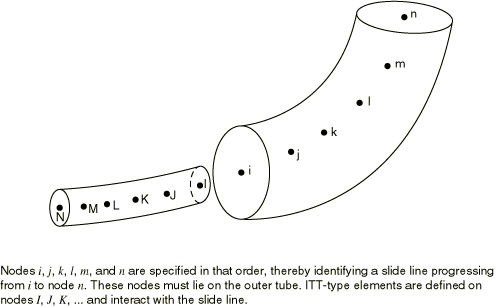 ProductsAbaqus/Standard Typical ApplicationsThe tube-to-tube contact elements can be used to model two specific classes of tube-to-tube contact problems: internal (tube within a tube) contact and external contact, where the two tubes are roughly parallel and contact each other along their outer surfaces. Choosing an appropriate elementUse ITT21 elements with two-dimensional beam, pipe, or truss elements. Use ITT31 elements with three-dimensional beam, pipe, or truss elements. Each of these elements is defined by a single node. Associating the tube-to-tube contact elements with a slide lineYou must indicate which set of tube-to-tube contact elements will interact with a particular slide line. Details on defining slide lines are discussed below. Input File Usage SLIDE LINE, ELSET=element_set_name Defining the element's section propertiesYou must associate the geometric section properties with a set of tube-to-tube contact elements. Input File Usage INTERFACE, ELSET=element_set_name Defining the radial clearance when modeling contact between a pipe within another pipeYou define the radial clearance between the pipes. Give a positive value to model contact between two pipes when one pipe (the one with the tube-to-tube contact elements) lies inside of the other pipe. The value given is the difference between the inner radius of the outer pipe and the outer radius of the inner pipe. Input File Usage INTERFACE radial clearance Defining the radial clearance when modeling contact between the outer surfaces of two pipesYou can model external tube-to-tube contact by specifying a negative value for the radial clearance. The magnitude of the value must be the sum of the outer radii of the two pipes or rods. Local basis for contact output variablesThe element output variables for ITT elements are given in a local basis system associated with the slide line. The first tangent vector, , is defined by the sequence of the nodes forming the slide line. The direction of contact, , is the normal to the slide line that points toward the nodes of the ITT elements. For ITT31 elements Abaqus/Standard forms a second tangent vector, , that is orthogonal to both and . As the elements move, the local basis system will rotate with the axis of the slide line. Choosing which pipe (beam or truss) will have the slide lineIn the case of internal tube-to-tube contact, the slide line can be placed on the inner tube or the outer tube. Generally the slide line should be associated with the outer tube (see Figure 1); however, if the inner tube is stiffer than the outer tube, the slide line should be attached to the inner tube. Figure 1. Internal tube-to-tube contact example.