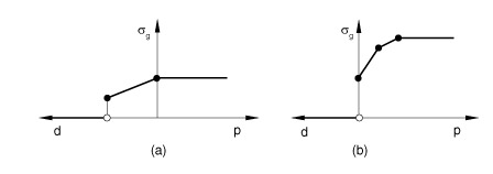 Defining gap electrical conductance as a function of clearanceYou can create a table of data defining the dependence of on the variables listed above. The default in Abaqus is to make a function of the clearance, d. When is a function of gap clearance, d, the tabular data must start at zero clearance (closed gap) and define as a function of the clearance. The value of remains constant for clearances outside of the interval defined by the data points. If gap electrical conductance is not also defined as a function of contact pressure, will remain constant at the zero clearance value for all pressures, as shown in Figure 1(a). Figure 1. Examples of defining the gap electrical conductance as a function of