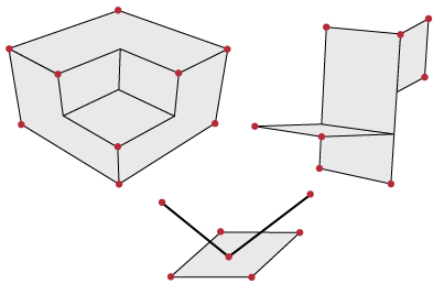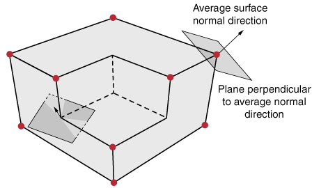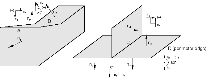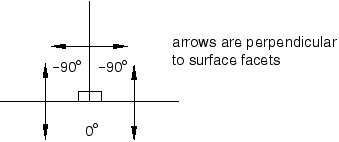 ![]() The feature angle for edge A is 90° (the angle between and ); the feature angle for edge B is −25° (the angle between and ). Edge C forms a T-intersection with three facets (shown in two dimensions in Figure 2); its feature angles are 0°, −90°, and −90°. Figure 2. Feature angles for a T-intersection.
