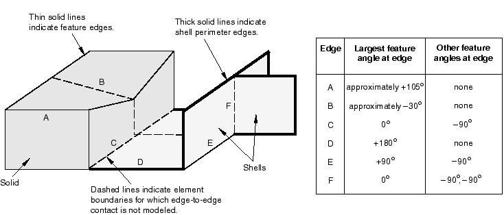 ![]() Perimeter edges (for example, edge D in Figure 1) can be thought of as a special type of feature edge where the feature angle is 180°. If a feature angle criterion is in effect (by default or because you specified it), geometric edges of solid and shell bodies with feature angles greater than or equal to the specified angle are included in the general contact domain. The contact inclusion and exclusion options (discussed in About general contact in Abaqus/Standard) apply to the surface-to-surface contact formulation, the edge-to-surface contact formulation, and the edge-to-edge contact formulation (and further control which portions of surfaces may interact with either formulation). The sign of the feature angle is considered when determining whether or not a geometric feature edge should be included in the general contact domain. For example, if a cutoff feature angle of 20° were specified, edge A would be activated as a feature edge in the contact model (because the feature angle of 90° is greater than the cutoff of 20°) but edges B and C would not be activated (because the feature angle at edge B is −25° and the maximum feature angle at edge C is 0°, which are both less than the cutoff of 20°). The cutoff feature angle cannot be set to less than 0° or more than 180°. Specifying a small cutoff feature angle (for example, less than 20°) may considerably increase run time without a major impact on the results compared to a larger cutoff angle (> 20°). The default feature angle cutoff for edge-to-surface contact is 45°, while the default is not to include feature edges in edge-to-edge contact. The criterion for including edges for edge-to-surface contact can be different from the criterion for including edges for edge-to-edge contact; the two are completely independent. Figure 3 illustrates further how the feature angle is used to determine which geometric feature edges are activated in the general contact domain. Figure 3. Feature edges activated in the general contact domain for a cutoff