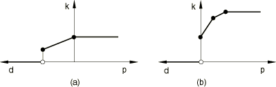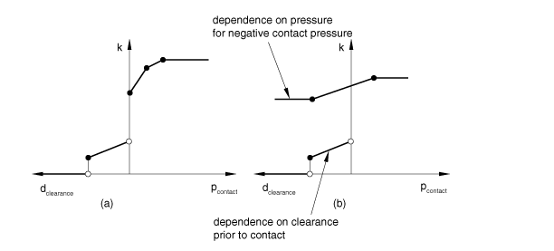 ![]() Defining gap conductance as a function of contact pressureYou can define k as a function of the contact pressure, p. When k is a function of contact pressure at the interface, the tabular data must start at zero contact pressure (or, in the case of contact that can support a tensile force, the data point with the most negative pressure) and define k as p increases. The value of k remains constant for contact pressures outside of the interval defined by the data points. If gap conductance is not also defined as a function of clearance, k is zero for all positive values of clearance and discontinuous at zero clearance, as shown in Figure 1(b). Input File Usage GAP CONDUCTANCE, PRESSURE , p, Abaqus/CAE Usage Interaction module: contact property editor: Definition: Tabular, Use only pressure-dependency data: Gap conductance as a function of both clearance and contact pressurek can depend on both clearance and pressure. A discontinuity in k is allowed at and . At the state of zero clearance and zero pressure the value of k corresponding to the zero pressure data point is used, as shown in Figure 2(a). Figure 2. Examples of input data to define the gap conductance as a function