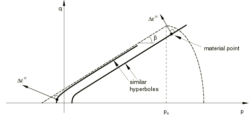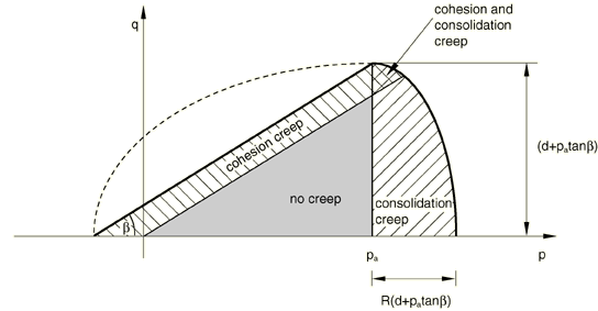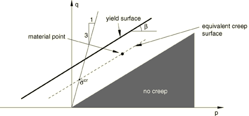 ![]() Equivalent creep surface and equivalent creep stress for the cohesion creep mechanismConsider the cohesion creep mechanism first. We adopt the notion of the existence of creep isosurfaces of stress points that share the same creep “intensity,” as measured by an equivalent creep stress. Since it is desirable to have the equivalent creep surface coincide with the yield surface, we define the equivalent creep surfaces by homogeneously scaling down the yield surface. In the p–q plane the equivalent creep surfaces translate into surfaces that are parallel to the yield surface, as depicted in Figure 6. Figure 6. Equivalent creep stress for cohesion creep.