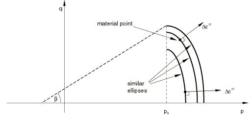 ![]() Abaqus/Standard protects for numerical problems that may arise for very low stress values. See Drucker-Prager/Cap model for geological materials for details. The creep strain rate produced by the consolidation mechanism is assumed to follow a potential that is similar to that of the plastic strain rate in the cap yield surface (Figure 8): Figure 8. Consolidation creep potentials in the