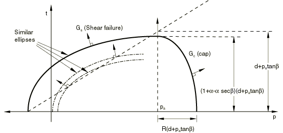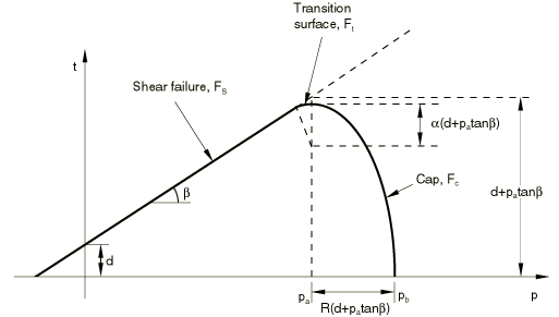 In using this form of the power law model with the consolidation mechanism, can be replaced by , the effective creep pressure, in the above relation. Input File Usage Use either or both of the following options: CAP CREEP, MECHANISM=COHESION, LAW=TIME CAP CREEP, MECHANISM=CONSOLIDATION, LAW=TIME Abaqus/CAE Usage Define one or both of the following: Property module: material editor: Law: Time : Law: Time: : “Strain hardening” form of the power law modelAs an alternative to the “time hardening” form of the power law, as defined above, the corresponding “strain hardening” form can be used. For the cohesion mechanism this law has the form In using this form of the power law model with the consolidation mechanism, can be replaced by , the effective creep pressure, in the above relation. For physically reasonable behavior A and n must be positive and . Input File Usage Use either or both of the following options: CAP CREEP, MECHANISM=COHESION, LAW=STRAIN CAP CREEP, MECHANISM=CONSOLIDATION, LAW=STRAIN Abaqus/CAE Usage Define one or both of the following: Property module: material editor: Law: Strain : Law: Strain: : Singh-Mitchell lawA second cohesion creep law available as data input is a variation of the Singh-Mitchell law: where , t, and are defined above and A, , , and m are user-defined creep material parameters specified as functions of temperature and field variables. For physically reasonable behavior A and must be positive, , and should be small compared to the total time. In using this variation of the Singh-Mitchell law with the consolidation mechanism, can be replaced by , the effective creep pressure, in the above relation. Input File Usage Use either or both of the following options: CAP CREEP, MECHANISM=COHESION, LAW=SINGHM CAP CREEP, MECHANISM=CONSOLIDATION, LAW=SINGHM Abaqus/CAE Usage Define one or both of the following: Property module: material editor: Law: SinghM : Law: SinghM: : Time-dependent behaviorIn the time hardening power law model and the Singh-Mitchell law model the total time or the creep time can be used. The total time is the accumulated time over all general analysis steps. The creep time is the sum of the times of the procedures with time-dependent material behavior. If the total time is used, it is recommended that small step times compared to the creep time be used for any steps for which creep is not active in an analysis; this is necessary to avoid changes in hardening behavior in subsequent steps. Input File Usage Use one of the following options: CAP CREEP, TIME=TOTAL (default) CAP CREEP, TIME=CREEP Abaqus/CAE Usage Specifying the time type is not supported in Abaqus/CAE. Numerical difficultiesDepending on the choice of units for the creep laws described above, the value of A may be very small for typical creep strain rates. If A is less than 10−27, numerical difficulties can cause errors in the material calculations; therefore, use another system of units to avoid such difficulties in the calculation of creep strain increments. Creep integrationAbaqus/Standard provides both explicit and implicit time integration of creep and swelling behavior. The choice of the time integration scheme depends on the procedure type, the parameters specified for the procedure, the presence of plasticity, and whether or not a geometric linear or nonlinear analysis is requested, as discussed in Rate-dependent plasticity: creep and swelling. Initial conditionsThe initial stress at a point can be defined (see Defining initial stresses). If such a stress point lies outside the initially defined cap or transition yield surfaces and under the projection of the shear failure surface in the p–t plane (illustrated in Figure 1), Abaqus will try to adjust the initial position of the cap to make the stress point lie on the yield surface and a warning message will be issued. If the stress point lies outside the Drucker-Prager failure surface (or above its projection), an error message will be issued and execution will be terminated. ElementsThe modified Drucker-Prager/Cap material behavior can be used with plane strain, generalized plane strain, axisymmetric, and three-dimensional solid (continuum) elements. This model cannot be used with elements for which the assumed stress state is plane stress (plane stress, shell, and membrane elements). OutputIn addition to the standard output identifiers available in Abaqus (Abaqus/Standard output variable identifiers and Abaqus/Explicit output variable identifiers), the following variables have special meaning in the cap plasticity/creep model: