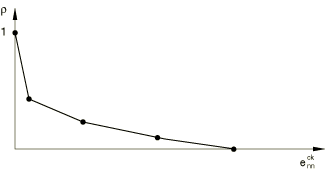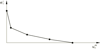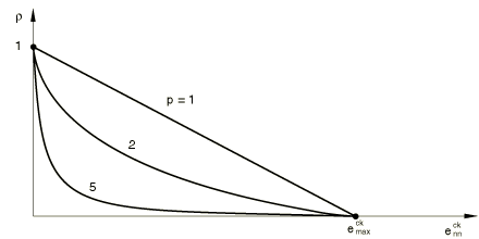 ![]() Alternatively, shear retention can be defined in the power law form: where p and are material parameters. This form, shown in Figure 5, satisfies the requirements that as (corresponding to the state before crack initiation) and as (corresponding to complete loss of aggregate interlock). See A cracking model for concrete and other brittle materials for a discussion of how shear retention is calculated in the case of two or more cracks. Figure 5. Power law form of the shear retention model.