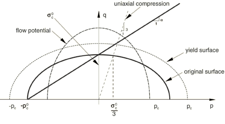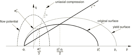 The yield surface represents the Mises circle in the deviatoric stress plane. The shape of the yield surface in the meridional stress plane is depicted in Figure 3. The shape factor, , can be computed using the initial yield stress in uniaxial compression, , and the initial yield stress in hydrostatic compression, (the initial value of ), using the relation: Figure 3. Crushable foam model with isotropic hardening: yield surface and flow