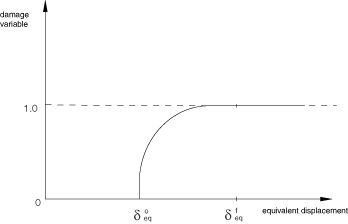 ![]() Equivalent displacement and stress for each of the four damage modes are defined as follows: Fiber tension : Fiber compression : Matrix tension : Matrix compression : The characteristic length, , is based on the element geometry and formulation: it is a typical length of a line across an element for a first-order element; it is half of the same typical length for a second-order element. For membranes and shells it is a characteristic length in the reference surface, computed as the square root of the area. Alternatively, this characteristic length could be defined as a function of the element topology and material orientation in user subroutine VUCHARLENGTH (see Defining the characteristic element length at a material point in Abaqus/Explicit). The symbol in the equations above represents the Macaulay bracket operator, which is defined for every as . After damage initiation (i.e., ) for the behavior shown in Figure 1, the damage variable for a particular mode is given by the following expression where is the initial equivalent displacement at which the initiation criterion for that mode was met and is the displacement at which the material is completely damaged in this failure mode. The above relation is presented graphically in Figure 2. Figure 2. Damage variable as a function of equivalent displacement.