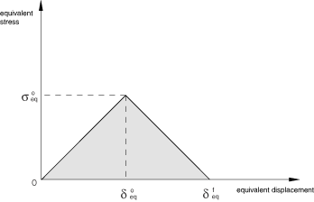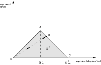 ![]() The values of for the various modes depend on the elastic stiffness and the strength parameters specified as part of the damage initiation definition (see Damage initiation for fiber-reinforced composites). For each failure mode you must specify the energy dissipated due to failure, , which corresponds to the area of the triangle OAC in Figure 3. Figure 3. Linear damage evolution.