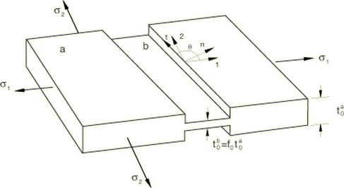 ![]() Abaqus/Explicit allows the specification of an anisotropic distribution of thickness imperfections as a function of angle with respect to the local material orientation, . Abaqus/Explicit first solves for the stress-strain field in the nominal area ignoring the presence of imperfections; then it considers the effect of each groove alone. The deformation field inside each groove is computed by enforcing the strain compatibility condition and the force equilibrium equations The subscripts n and t refer to the directions normal and tangential to the groove. In the above equilibrium equations and are forces per unit width in the t-direction. The onset of necking instability is assumed to occur when the ratio of the rate of deformation inside a groove relative to the rate of deformation if no groove were present is greater than a critical value. In addition, it may not be possible to find a solution that satisfies equilibrium and compatibility conditions once localization initiates at a particular groove; consequently, failure to find a converged solution is also an indicator of the onset of localized necking. For the evaluation of the damage initiation criterion Abaqus/Explicit uses the following measures of deformation severity: These deformation severity factors are evaluated on each of the specified groove directions and compared with the critical values. (The evaluation is performed only if the incremental deformation is primarily plastic; the M-K criterion will not predict damage initiation if the deformation increment is elastic.) The most unfavorable groove direction is used for the evaluation of the damage initiation criterion, which is given as where , , and are the critical values of the deformation severity indices. Damage initiation occurs when or when a converged solution to the equilibrium and compatibility equations cannot be found. By default, Abaqus/Explicit assumes ; you can specify different values. If one of these parameters is set equal to zero, its corresponding deformation severity factor is not included in the evaluation of the damage initiation criterion. If all of these parameters are set equal to zero, the M-K criterion is based solely on nonconvergence of the equilibrium and compatibility equations. You must specify the fraction, , equal to the initial thickness at the virtual imperfection divided by the nominal thickness (see Figure 2), as well as the number of imperfections to be used for the evaluation of the M-K damage initiation criterion. It is assumed that these directions are equally spaced angularly. By default, Abaqus/Explicit uses four imperfections located at 0°, 45°, 90°, and 135° with respect to the local 1-direction of the material. The initial imperfection size can be defined as a tabular function of angular direction, ; this allows the modeling of an anisotropic distribution of flaws in the material. Abaqus/Explicit will use this table to evaluate the thickness of each of the imperfections that will be used for the evaluation of the M-K analysis method. In addition, the initial imperfection size can also be a function of initial temperature and field variables; this allows defining a nonuniform spatial distribution of imperfections. Abaqus/Explicit will compute the initial imperfection size based on the values of temperature and field variables at the beginning of the analysis. The initial size of the imperfection remains a constant property during the rest of the analysis. A general recommendation is to choose the value of such that the forming limit predicted numerically for uniaxial strain loading conditions () matches the experimental result. The virtual grooves are introduced to evaluate the onset of necking instability; they do not influence the results in the underlying element. Once the criterion for necking instability is met, the material properties in the element are degraded according to the specified damage evolution law. Input File Usage Use the following option to specify the initial imperfection thickness relative to the nominal thickness as a tabular function of the angle with respect to the 1-direction of the local material orientation and, optionally, initial temperature and field variables: DAMAGE INITIATION, CRITERION=MK, DEPENDENCIES=n Use the following option to specify critical deformation severity factors: DAMAGE INITIATION, CRITERION=MK, FEQ=, FNN=, FNT= Abaqus/CAE Usage Property module: material editor: Performance considerations for the M-K criterionThere can be a substantial increase in the overall computational cost when the M-K criterion is used. For example, the cost of processing a shell element with three section points through the thickness and four imperfections, which is the default for the M-K criterion, increases by approximately a factor of two compared to the cost without the M-K criterion. You can mitigate the cost of evaluating this damage initiation criterion by reducing the number of flaw directions considered or by increasing the number of increments between M-K computations, as explained below. Of course, the effect on the overall analysis cost depends on the fraction of the elements in the model that use this damage initiation criterion. The computational cost per element with the M-K criterion increases by approximately a factor of where is the number of imperfections specified for the evaluation of the M-K criterion and is the frequency, in number of increments, at which the M-K computations are performed. The coefficient of in the above formula gives a reasonable estimate of the cost increase in most cases, but the actual cost increase may vary from this estimate. By default, Abaqus/Explicit performs the M-K computations on each imperfection at each time increment, . Care must be taken to ensure that the M-K computations are performed frequently enough to ensure the accurate integration of the deformation field on each imperfection. Input File Usage Use the following option to specify th