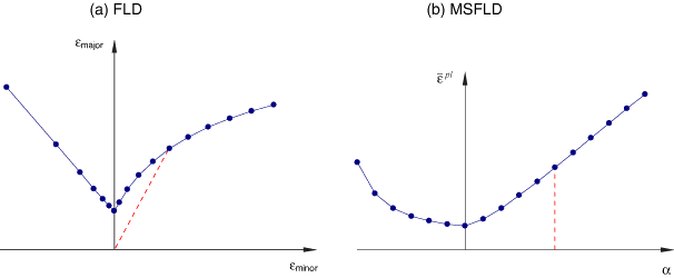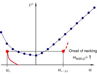 ![]() According to the MSFLD criterion, the onset of localized necking occurs when the sequence of deformation states in the – diagram intersects the forming limit curve, as discussed below. It is emphasized that for linear deformation paths both FLD and MSFLD representations are identical and give rise to the same predictions. For arbitrary loading, however, the MSFLD representation takes into account the effects of the history of deformation through the use of the accumulated equivalent plastic strain. For the specification of the MSFLD damage initiation criterion in Abaqus, you can directly provide the equivalent plastic strain at damage initiation as a tabular function of and, optionally, equivalent plastic strain rate, temperature, and predefined field variables, . Alternatively, you can specify the curve in the traditional FLD format (in the space of major and minor strains) by providing a tabular function of the form . In this case Abaqus will automatically transform the data into the – format. Let represent the ratio of the current equivalent plastic strain, , to the equivalent plastic strain on the limit curve evaluated at the current values of ; strain rate, ; temperature, ; and predefined field variables, : The MSFLD criterion for necking instability is met when the condition is satisfied. Necking instability also occurs if the sequence of deformation states in the – diagram intersects the limit curve due to a sudden change in the straining direction. This situation is illustrated in Figure 4. As changes from to , the line connecting the corresponding points in the – diagram intersects with the forming limit curve. When this situation occurs, the MSFLD criterion is reached despite the fact that . For output purposes Abaqus sets the value of equal to one to indicate that the criterion has been met. Figure 4. Illustration of how a sudden change in the straining direction, from