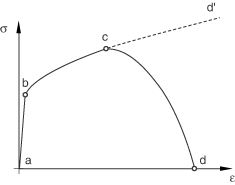 In addition, Abaqus offers a concrete damaged model (Concrete damaged plasticity), dynamic failure models (Dynamic failure models), and specialized capabilities for modeling damage and failure in cohesive elements (Defining the constitutive response of cohesive elements using a traction-separation description) and in connectors (Connector damage behavior). This section provides an overview of the progressive damage and failure capability and a brief description of the concepts of damage initiation and evolution. The discussion in this section is limited to damage models for ductile metals and fiber-reinforced materials. General framework for modeling damage and failureAbaqus offers a general framework for material failure modeling that allows the combination of multiple failure mechanisms acting simultaneously on the same material. Material failure refers to the complete loss of load-carrying capacity that results from progressive degradation of the material stiffness. The stiffness degradation process is modeled using damage mechanics. To help understand the failure modeling capabilities in Abaqus, consider the response of a typical metal specimen during a simple tensile test. The stress-strain response, such as that illustrated in Figure 1, will show distinct phases. The material response is initially linear elastic, , followed by plastic yielding with strain hardening, . Beyond point c there is a marked reduction of load-carrying capacity until rupture, . The deformation during this last phase is localized in a neck region of the specimen. Point c identifies the material state at the onset of damage, which is referred to as the damage initiation criterion. Beyond this point, the stress-strain response is governed by the evolution of the degradation of the stiffness in the region of strain localization. In the context of damage mechanics can be viewed as the degraded response of the curve that the material would have followed in the absence of damage. Figure 1. Typical uniaxial stress-strain response of a metal specimen.