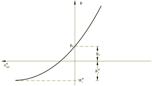 ProductsAbaqus/StandardAbaqus/CAE Logarithmic porous elasticity modelThe logarithmic porous elasticity model is valid for small elastic strains (normally less than 5%). It is a nonlinear, isotropic elasticity model in which the pressure stress varies as an exponential function of volumetric strain. The model allows a zero or nonzero elastic tensile stress limit. Defining the volumetric behaviorOften, the elastic part of the volumetric behavior of porous materials is modeled accurately by assuming that the elastic part of the change in volume of the material is proportional to the logarithm of the pressure stress (Figure 1): where is the “logarithmic bulk modulus”; is the initial void ratio; p is the equivalent pressure stress, defined by is the initial value of the equivalent pressure stress; is the elastic part of the volume ratio between the current and reference configurations; and is the “elastic tensile strength” of the material (in the sense that as ). Figure 1. Porous elastic volumetric behavior.