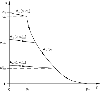 ![]() The function captures the general behavior to be expected in a ductile porous material. The unloaded virgin state corresponds to the value , where is the reference porosity of the material. Initial compression of the porous material is assumed to be elastic. Recall that decreasing porosity corresponds to a reduction in . As the pressure increases beyond the elastic limit, , the pores in the material start to crush, leading to irreversible compaction and permanent (plastic) volume change. Unloading from a partially compacted state follows a new elastic curve that depends on the maximum compaction (or, alternatively, the minimum value of ) ever attained during the deformation history of the material. The absolute value of the slope of the elastic curve decreases as decreases, as will be quantified later. The material becomes fully compacted when the pressure reaches the compaction pressure ; at that point , a value that is retained forever. The function therefore has multiple branches: a plastic branch, , and multiple elastic branches, , corresponding to elastic unloading from partially compacted states. The appropriate branch of A is selected according to the following rule: These expressions can be inverted to solve for p: The equation for the plastic curve takes the form or, alternatively, The elastic curve originally proposed by Hermann (1968) is given by the differential equation where is the elastic bulk modulus of the solid material at small nominal strains; is the reference density of the solid; and and are the reference sound speeds in the solid and virgin (porous) materials, respectively. If the solid phase is modeled using the Mie-Grüneisen equation of state, is given directly by the reference sound speed, . On the other hand, if the solid phase is modeled using the tabulated equation of state, is computed from the initial bulk modulus and reference density of the solid material, . In this case the reference density is required to be constant; it cannot be a function of temperature or field variables. Following Wardlaw et al. (1996), the above equation for the elastic curve in Abaqus/Explicit is simplified and replaced by the linear relations and Input File Usage Use the following option to specify the reference density of the solid phase, : DENSITY Use one of the following options to specify additional material properties for the solid phase: EOS, TYPE=USUP (if the solid phase is modeled using the Mie-Grüneisen equation of state) EOS, TYPE=TABULAR (if the solid phase is modeled using the tabulated equation of state) Use the following option to specify the properties of the porous material (the reference sound speed, ; the reference porosity, ; the elastic limit, ; and the compaction pressure, ): EOS COMPACTION Abaqus/CAE Usage Property module: material editor: (to specify the reference density ) Use one of the following options to specify additional material properties for the solid phase: Type: Us - Up (if the solid phase is modeled using the Mie-Grüneisen equation of state) : Type: Tabular (if the solid phase is modeled using the tabulated equation of state): Use the following option to specify the properties of the porous material: (to specify the reference sound speed, ; the porosity of the unloaded material, ; the pressure required to initialize plastic behavior, ; and the pressure at which all pores are crushed, ): Initial stateThe initial state of the porous material is determined from the initial values of porosity, ; specific energy, ; and pressure stress, p. Abaqus/Explicit automatically computes the initial density, , that satisfies the equation of state, . You can define the initial porosity, initial specific energy, and initial stress state (see Initial conditions in Abaqus/Standard and Abaqus/Explicit). If no initial conditions are given, Abaqus/Explicit assumes that the material is at its virgin state: Abaqus/Explicit will issue an error message if the initial state lies outside the region of allowed states (see Figure 2). When initial conditions are specified only for p (or for ), Abaqus/Explicit will compute (or p) assuming that the state lies on the primary (monotonic loading) curve. Input File Usage Use some or all of the following options, as required: INITIAL CONDITIONS, TYPE=SPECIFIC ENERGY INITIAL CONDITIONS, TYPE=STRESS INITIAL CONDITIONS, TYPE=POROSITY Abaqus/CAE Usage Load module: Create Predefined Field: Step: Initial: choose Mechanical for the Category and Stress for the Types for Selected Step Initial specific energy and initial porosity are not supported in Abaqus/CAE. JWL high explosive equation of stateThe Jones-Wilkins-Lee (or JWL) equation of state models the pressure generated by the release of chemical energy in an explosive. This model is implemented in a form referred to as a programmed burn, which means that the reaction and initiation of the explosive is not determined by shock in the material. Instead, the initiation time is determined by a geometric construction using the detonation wave speed and the distance of the material point from the detonation points. The JWL equation of state can be written in terms of the internal energy per unit mass, , as where and are user-defined material constants; is the user-defined density of the explosive; and is the density of the detonation products. Input File Usage Use both of the following options: DENSITY (to specify the density of the explosive ) EOS, TYPE=JWL (to specify the material constants and ) Abaqus/CAE Usage Property module: material editor: (to specify the density of the explosive ) : Type: JWL (to specify the material constants and ) Arrival time of detonation waveAbaqus/Explicit calculates the arrival time of the detonation wave at a material point as the distance from the material point to the nearest detonation point divided by the detonation wave speed: where is the position of the material point, is the position of the Nth detonation point, is the detonation delay time 