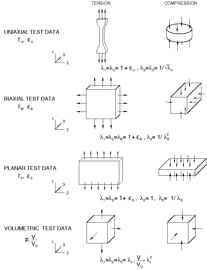 These modes are illustrated schematically in Figure 2 and are described below. The most commonly performed experiments are uniaxial tension, uniaxial compression, and planar tension. Figure 2. Schematic illustrations of deformation modes.
