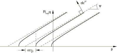 ![]() Flow in the meridional stress plane can be close to associated when the angle of friction, , and the angle of dilation, , are equal and the meridional eccentricity, , is very small; however, flow in this plane is, in general, nonassociated. Flow in the deviatoric stress plane is always nonassociated. Input File Usage Use the following option to allow Abaqus to calculate the value of e (default): MOHR COULOMB Use the following option to specify the value of e directly: MOHR COULOMB, DEVIATORIC ECCENTRICITY=e Abaqus/CAE Usage Use the following option to allow Abaqus to calculate the value of e (default): Property module: material editor: Plasticity: Deviatoric eccentricity: Calculated default: Use the following option to specify the value of e directly: Property module: material editor: Plasticity: Deviatoric eccentricity: Specify: e: Plastic flow on the Rankine surfaceA flow potential that results in a nearly associative flow is chosen for the Rankine surface and is constructed by modifying the Menétrey-Willam potential described earlier: where