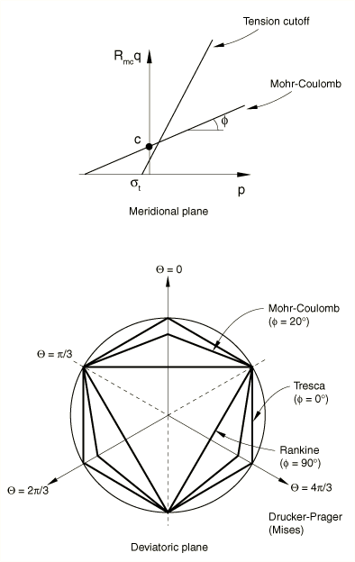 The friction angle, , controls the shape of the yield surface in the deviatoric plane as shown in Figure 2. The tension cutoff surface is shown for a meridional angle of . The friction angle range is . In the case of the Mohr-Coulomb model reduces to the pressure-independent Tresca model with a perfectly hexagonal deviatoric section. In the case of the Mohr-Coulomb model reduces to the “tension cutoff” Rankine model with a triangular deviatoric section and (this limiting case is not permitted within the Mohr-Coulomb model described here). When using one-element tests to verify the calibration of the model, the output variables SP1, SP2, and SP3 correspond to the principal stresses , , and , respectively. Figure 2. Mohr-Coulomb and tension cutoff surfaces in meridional and deviatoric