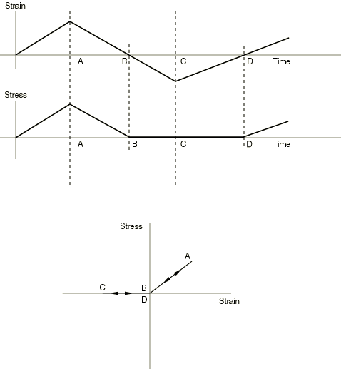 ProductsAbaqus/StandardAbaqus/CAE Defining the modified elastic behaviorThe modified elastic behavior is obtained by first solving for the principal stresses assuming linear elasticity and then setting the appropriate principal stress values to zero. The associated stiffness matrix components will also be set to zero. These models are not history dependent: the directions in which the principal stresses are set to zero are recalculated at every iteration. The no compression effect for a one-dimensional stress case such as a truss or a layer of a beam in a plane is illustrated in Figure 1. No compression and no tension definitions modify only the elastic response of the material. Figure 1. A no compression elastic case with an imposed strain cycle.