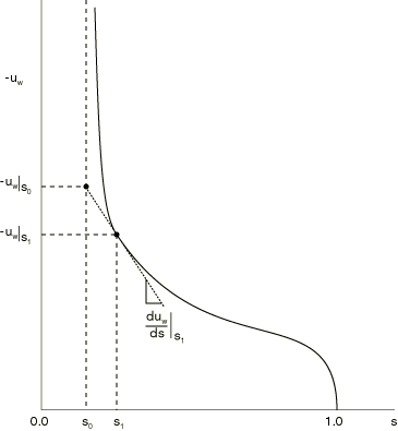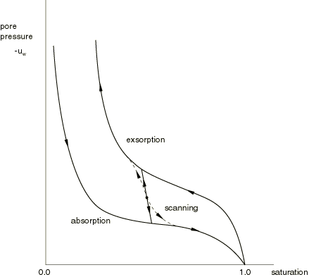 ProductsAbaqus/StandardAbaqus/CAE SorptionA porous medium becomes partially saturated when the total pore liquid pressure, , becomes negative (see Effective stress principle for porous media). Negative values of represent capillary effects in the medium. For it is known that the saturation lies within certain limits that depend on the value of the capillary pressure, (see Continuity statement for the wetting liquid phase in a porous medium). Typical forms of these limits are shown in Figure 1. We write these limits as , where is the limit at which absorption will occur (so that ), and is the limit at which exsorption will occur (so that ). The transition between absorption and exsorption and vice versa takes place along “scanning” curves (discussed below). These curves are approximated by the single straight line shown in Figure 1. Figure 1. Typical absorption and exsorption behaviors.