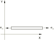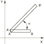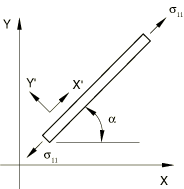 ProductsAbaqus/StandardAbaqus/ExplicitAbaqus/CAE Stress components and strain incrementsThe subroutine interface has been implemented using Cauchy stress components (“true” stress). For soils problems “stress” should be interpreted as effective stress. The strain increments are defined by the symmetric part of the displacement increment gradient (equivalent to the time integral of the symmetric part of the velocity gradient). The orientation of the stress and strain components in user subroutine UMAT depends on the use of local orientations (Orientations). In user subroutine VUMAT all strain measures are calculated with respect to the midincrement configuration. All tensor quantities are defined in the corotational coordinate system that rotates with the material point. To illustrate what this means in terms of stresses, consider the bar shown in Figure 1, which is stretched and rotated from its original configuration, , to its new position, . This deformation can be obtained in two stages; the bar is first stretched, as shown in Figure 2, and is then rotated by applying a rigid body rotation to it, as shown in Figure 3. Figure 1. Stretched and rotated bar.