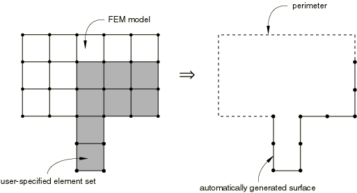 ![]() Input File Usage SURFACE, NAME=surface_name, TYPE=ELEMENT element number or element set, For example, if the name of the shaded element set in Figure 2 is ESETA, the surface named ASURF is specified by SURFACE, NAME=ASURF, TYPE=ELEMENT ESETA, Abaqus/CAE Usage The automatic free surface generation method is not supported in Abaqus/CAE. Figure 2. Automatic free surface generation.