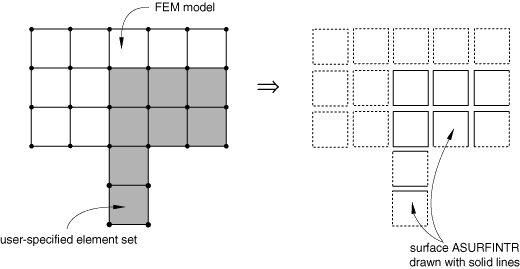 Generating an interior surface automaticallyIn Abaqus/Explicit you can define the facets of a surface on the interior of a solid element mesh. The faces of the specified elements that are not on the exterior (free) surface of the model will be included in the surface definition. For example, interior surfaces are used with the general contact algorithm in Abaqus/Explicit for modeling surface erosion due to element failure (see About general contact in Abaqus/Explicit). The automatic generation of an interior surface is equivalent to constructing a surface consisting of all faces of the elements and then subtracting the free surfaces of those elements. Shell elements, beam elements, pipe elements, membrane elements, etc. are ignored since they do not have any interior faces by definition. Multi-point constraints are not taken into account when generating interior surfaces. This can result in faces that are on the interior of a body being excluded from the surface definition. Input File Usage SURFACE, NAME=surface_name, TYPE=ELEMENT element number or element set, INTERIOR For example, if the name of the shaded element set in Figure 3 is ESETA, the surface named ASURFINTR (the elements in the figure have been reduced in size to differentiate faces that share the same nodes) is specified by SURFACE, NAME=ASURFINTR, TYPE=ELEMENT ESETA, INTERIOR Abaqus/CAE Usage Any module except Sketch, Job, and Visualization: Name: surface_name, Type: Mesh; pick element faces or edges from an interior surface: You can use the selection tools to select from an interior entity of a model; see Selecting interior surfaces. Figure 3. Automatic interior surface generation.
