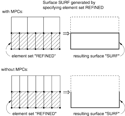 The automatic free surface generation approach is the simplest method of defining exterior surfaces on solid elements. Specifying the element faces gives you exact control over which element faces (any combination of exterior and interior faces) form the surface. Automatic generation of an interior surface is the simplest method of defining interior surfaces on solid elements (interior surfaces can be useful for modeling surface erosion due to element failure). It is possible to use all three approaches in the same surface definition when creating a single surface. Generating the free surface automaticallyYou can define the facets of a surface by specifying a series of elements. The faces of these elements that are on the exterior (free) surface of the model are included in the surface definition. When the free surface generation method is used to define surfaces, the specified elements can be a mixture of continuum and structural elements. Multi-point constraints (General multi-point constraints) involving nodes on exposed surfaces are not taken into account during free surface generation, which can result in faces that are not on the exterior of a body being included in surface definitions. For example, the nodes of the elements in element set REFINED shown in Figure 1 are used in linear, mesh-refinement constraints. The surfaces generated with and without multi-point constraints are shown in Figure 1. Figure 1. Effect of multi-point constraints on automatic surface