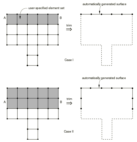 Input File Usage Use the following option to suppress automatic surface trimming: SURFACE, TYPE=ELEMENT, NAME=surface_name, TRIM=NO Abaqus/CAE Usage Automatic surface trimming cannot be suppressed in Abaqus/CAE. The effect of surface trimmingThe effect of surface trimming is best explained by means of an example. Figure 5 illustrates the effect of trimming for two different surfaces defined on the same simple two-dimensional mesh. Figure 5. Case I: Faces A and B are