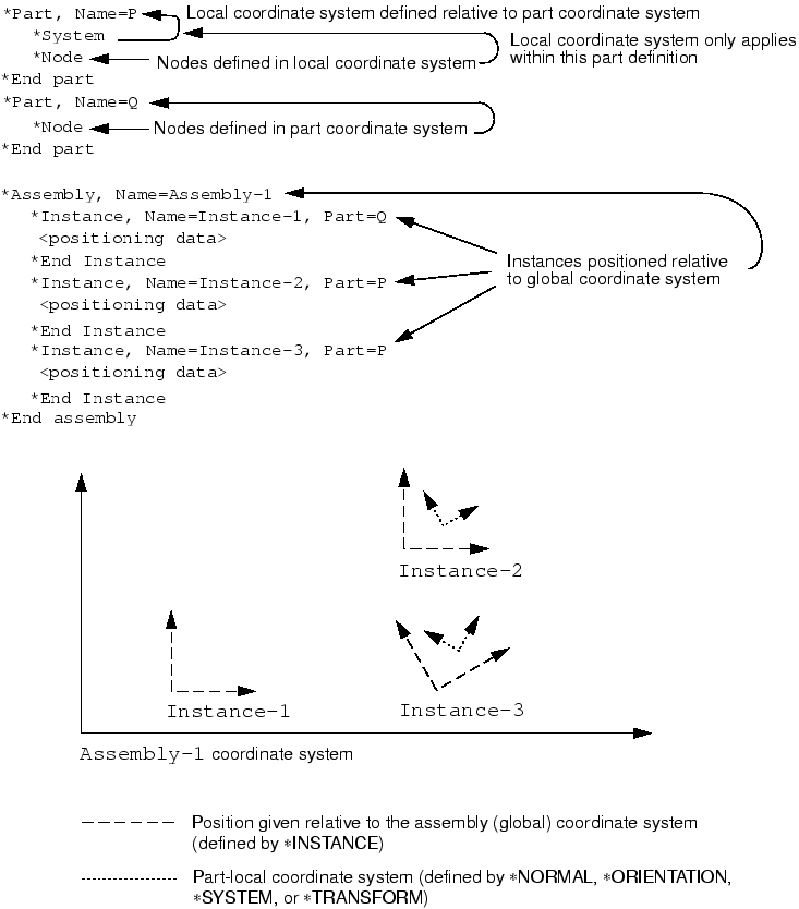 ProductsAbaqus/StandardAbaqus/Explicit IntroductionA physical model is typically created by assembling various components. The assembly interface in Abaqus allows analysts to create a finite element mesh using an organizational scheme that parallels the physical assembly. In Abaqus the components that are assembled together are called part instances. This section explains how to organize an Abaqus finite element model in terms of an assembly of part instances. The mesh is created by defining parts, then assembling instances of each part. Each part can be used (instanced) one or more times, and each part instance has its own position within the assembly. This organization of the model definition matches the way models are created in Abaqus/CAE, where the assembly can be created interactively or imported from an input file (see the Introduction). Terminology