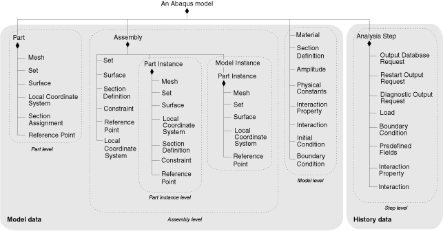 Organizing the model definitionIn a traditional Abaqus model without an assembly definition, the components of the model fall into one of two categories: model data (step independent) and history data (step dependent). In an Abaqus model that is organized into an assembly of part instances, all components are further categorized and must fall within the proper level: part, assembly, instance, step, or model. Step-level components correspond to history data; all step-dependent component definitions must appear within a step definition (see Defining an analysis). Model-level data include everything that does not fall into part-, assembly-, instance-, or step-level data (for example, material definitions; see Figure 3). The proper level within which a keyword option must appear in the input file is indicated at the top of each section in the Abaqus Keywords Guide. Figure 3. Organization of a model defined in terms of an assembly of part