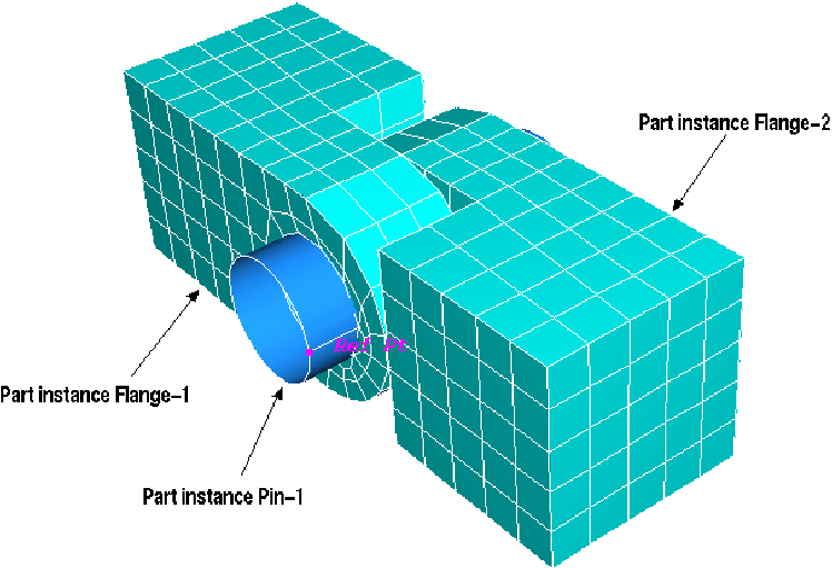 ExampleA hinge can be modeled using two flanges and a pin, as shown in Figure 1. The flange geometry is defined by creating a part, which is instanced twice inside the hinge assembly. Another part, the pin, is created and instanced once. The pin is modeled as a rigid body created from an analytical surface (see Analytical rigid surface definition). Figure 1. The hinge assembly.