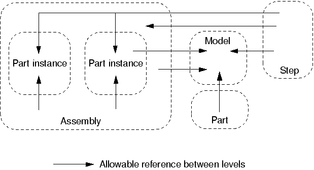 ![]() Rules for defining an assemblyThe organization shown in Figure 3 is achieved by following a few basic rules. Referring to items between levelsWhen creating a model, it is often necessary to refer to something outside of the current level; for example, a section definition within a part must refer to a material, which is defined at the model level. Loads defined within a step must refer to sets within the assembly. But some references between levels are not allowed; for example, a set in one part instance cannot refer to nodes in another part instance. The following references are allowed: