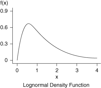 ![]() Input File Usage PROBABILITY DENSITY FUNCTION, TYPE=NORMAL Log-normal probability density functionLog-normal distributions (shown in Figure 4) are used in describing many natural phenomena. They are commonly used to describe particle size distributions in soils. The following function describes a log-normal probability density function: The mean, , and standard deviation, , in the space are related to and as follows: where the parameters and are the mean and standard deviation in the space; given by and respectively. You specify the mean, , and the standard deviation, , in the space for the log-normal distribution. Figure 4. Log-normal PDF.