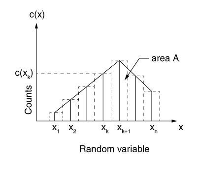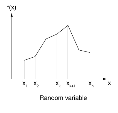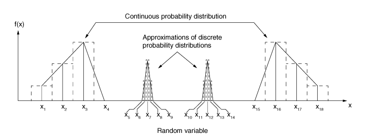 ![]() There may be situations where the random variable has continuous values over certain ranges and discrete values elsewhere. Figure 7 shows the use of a piecewise linear probability density function to approximate such distributions where the discrete values are approximated by continuous random variables spanning a very narrow range of values (for example, the discrete value is approximated by the continuous range from to ). Figure 7. Approximating a discrete probability distribution using a piecewise