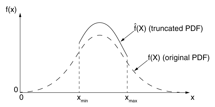 ![]() Truncated probability density functionThe normal and log-normal probability density functions have open-ended characteristics. These PDFs can be truncated to enforce upper and lower bounds on the value of the random variable. Figure 9 shows a truncated normal distribution where all values of the random variable and from the untruncated normal distribution have been rejected. where The factor represents the probability that the random variable is in the range from to for the untruncated PDF. Figure 9. Truncated PDF.