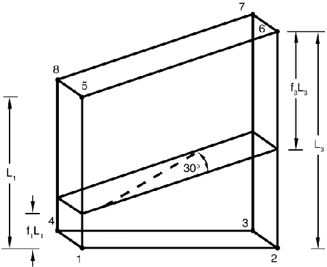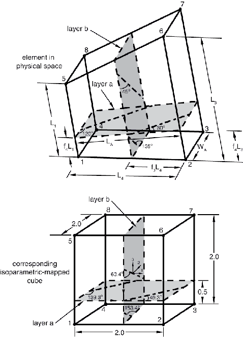 ![]() From the figure . The length of the rebar layer along the intersecting line is L, and the length of the opposite edge is W. Consider the same rebar in the rebar layer in the isoparametric-mapped cube. The orientation angle, , is given by , where and . (The 2 is included because the isoparametric-mapped cube is a 2 × 2 × 2 cube.) This expression can be simplified to give For layer A, , , , and , where is the orientation angle that must be specified. The fractional distance defining the position of the intersection of layer B with this face can be measured from edge 3 (edge with nodes 6–2); . It could also be measured from edge 1 (edge with nodes 1–5), such that . The orientation angle for layer B in the rebar layer is 45°. In the isoparametric-mapped cube , , , and . Since an isoparametric rebar layer always lies in two of the isoparametric directions, an alternative but equivalent definition can be given. For example, layer A also lies in isoparametric direction 1, with the intersecting face having nodes 1-4-8-5. The fractional distance for layer A, measured from edge 1 (edge with nodes 1–4), is . The positive sense of the line of intersection is from edge 2 (edge with nodes 4–8) to edge 4 (edge with nodes 5–1); therefore, , , , and . Layer B also lies in isoparametric direction 3, with the intersecting face having nodes 1-2-3-4. The fractional distance for layer B, measured from edge 2 (edge with nodes 2–3), is . The positive sense of the intersecting line is from edge 1 (edge with nodes 1–2) to edge 3 (edge with nodes 3–4); therefore, the orientation angle of the rebar in physical space is , , , and in the isoparametric-mapped cube . Defining skew rebarsYou specify the elements that contain the rebars; the cross-sectional area, A, of each rebar; the rebar spacing, s; the rebar orientation, (as described above); and the isoparametric direction. In addition, you specify the fractional distance falong the element edge for each edge of the intersecting face defined in Figure 12. Only the values corresponding to the two edges that the rebar intersects can be nonzero. Input File Usage Use the following option to define layers of skew rebars in three-dimensional continuum elements: REBAR, ELEMENT=CONTINUUM, MATERIAL=mat, GEOMETRY=SKEW Example: skew rebarFor example, the following input defines the skew rebar shown in Figure 16: Figure 16. Example defining skew rebar.