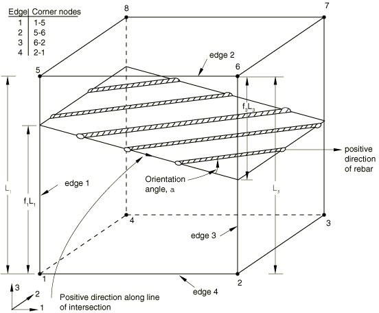 ![]() The position of each surface is given by the fractional distance f from an edge of the face defined in Figure 12 for the isoparametric direction chosen; you must specify the edge from which the fractional distance is measured. If skew rebars are defined, the two edges of the rebar surface, which are not parallel to the user-specified isoparametric direction, are generally not parallel to one of the other isoparametric directions. The positions of these two edges of the rebar surface are specified by the intersection of the rebar surface with edges of the intersecting face, defined in Figure 12, for the isoparametric direction chosen; the intersections are given by the fractional distance f along each edge of the face. (Note that the fractional distance is along the edge for skew rebars; for isoparametric rebars the fractional distances are measured from an edge.) The fractional distance along an edge is measured from the first node of the edge. All four fractional distances must be given, but only two can be nonzero. The orientation angle, , of the rebars within the rebar layer is defined in the isoparametric-mapped cube; it is measured in degrees and is the angle between the line of intersection of the rebar surface with the face for the isoparametric direction chosen and the rebar. The positive direction of the line of intersection is from the lower numbered edge to the higher numbered edge; the positive direction for the rebars points into the elements. An example is shown in Figure 14. The orientation angle is defined in the rebar layer in the isoparametric-mapped cube; therefore, the definition is the same for isoparametric and skew rebar. Figure 14. Orientation example for three-dimensional skew rebar modeling,
