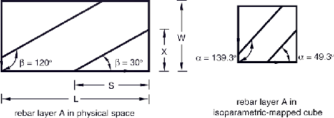 ![]() If the rebar layer is not flat in physical space, the orientation angle at each integration point may be different. Since it is possible to define only one orientation angle per element, an average value orientation angle for the element must be used; for reasonable meshes this approximation should not affect the results significantly. Defining isoparametric rebarsYou specify the elements that contain the rebars; the cross-sectional area, A, of each rebar; the rebar spacing, s; the rebar orientation, (as described above); the fractional distance, f, from the edge; the number of the edge from which the fractional distance is measured; and the isoparametric direction of the rebar surface. Input File Usage Use the following option to define layers of isoparametric rebars in three-dimensional continuum elements: REBAR, ELEMENT=CONTINUUM, MATERIAL=mat, GEOMETRY=ISOPARAMETRIC Example: isoparametric rebarFor example, the following input defines the isoparametric rebar shown in Figure 13: HEADING ISOPARAMETRIC REBAR NODE 1, 0., 0. 2, 10., 0. 3, 10., 5. 4, 0., 5. 5, 0., 0., 7.5 6, 10., 0., 12.5 7, 10., 5., 12.5 8, 0., 5., 7.5 ELEMENT, TYPE=C3D8R, ELSET=ONE 1,1,2,3,4,5,6,7,8 REBAR, ELEMENT=CONTINUUM, MATERIAL=STEEL, GEOMETRY=ISOPARAMETRIC, NAME=LAYER_A ONE,.04,2.5,49.32628,0.25,4,2 REBAR, ELEMENT=CONTINUUM, MATERIAL=STEEL, GEOMETRY=ISOPARAMETRIC, NAME=LAYER_B ONE,.04,1.,63.43494,0.5,3,2 MATERIAL, NAME=STEEL ELASTIC 30.E6, … Rebar layers A and B are defined using isoparametric direction 2. From Figure 12 the position of the layers must be given with respect to the face with nodes 1-5-6-2. The fractional distance defining the position of intersection of layer A with this face can be measured from edge 4 (edge with nodes 2–1) along edge 3 (edge with nodes 6–2), as shown in Figure 13. For layer A, . It could also be given from edge 2 (edge with nodes 5–6), so that . The orientation of rebar for layer A in physical space is defined by an angle, , equal to 30° for layer A. This angle must be transformed into the corresponding angle in the isoparametric-mapped cube. This transformation can be done as follows: consider a single rebar that intersects the intersecting line (described above) and an adjacent edge (see Figure 15). Figure 15. Example defining isoparametric rebar.