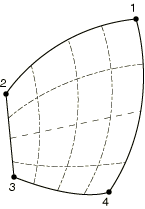 ![]() If opposite edges of the element containing the rebar are not parallel, the rebar directions will be different at each of the integration points within an element (see Figure 2). Figure 2. “Isoparametric” rebar directions in a distorted three-dimensional