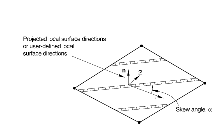 ![]() The spacing of the rebar will be fixed in physical space. The spacing, s, and the area of the rebar, A, are used to determine the thickness of the equivalent smeared layer, . If the edges of the element containing the rebar are not parallel, the number of actual rebar with this spacing passing through one edge will be different than the number passing through the opposite edge (opposite in isoparametric space). You specify the elements that contain the rebars; the cross-sectional area, A, of each rebar; the rebar spacing in the plane of the shell, s; and the edge number to which the rebars are parallel when plotted in isoparametric space (see Figure 1). In addition, for shell elements you specify the position of the rebars in the shell thickness direction measured from the midsurface of the shell (positive in the direction of the positive normal to the shell). If the shell's thickness is defined by nodal thicknesses (Nodal thicknesses), this distance is scaled by the ratio of the thickness defined by the nodal thickness to the thickness defined by the section definition. If the shell's thickness is defined with a distribution (Distribution definition), this distance is scaled by the ratio of the element thickness defined by the distribution to the default thickness. If the shell has a composite section whose layer thicknesses are defined with distributions (Distribution definition), this distance is scaled by the ratio of the sum of the element layer thicknesses defined by the distributions to the sum of the default layer thicknesses. Input File Usage Use the following option to define isoparametric rebars in three-dimensional shell elements: REBAR, ELEMENT=SHELL, MATERIAL=mat, GEOMETRY=ISOPARAMETRIC Use the following option to define isoparametric rebars in general membrane elements: REBAR, ELEMENT=MEMBRANE, MATERIAL=mat, GEOMETRY=ISOPARAMETRIC Defining skew rebars in three-dimensional shell and membrane elementsSkew rebars need not be similar to an element edge; they can lie at any prescribed angle from the local 1-axis. The direction of the rebars must be defined in one of two ways, as indicated in Figure 3: Figure 3. “Skew” rebar in a three-dimensional shell or membrane.