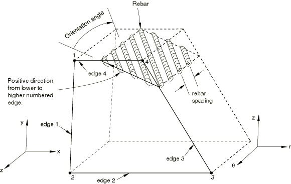 ![]() You specify the cross-sectional area, A, of each rebar; the rebar spacing, s; for shell elements the position of the rebars in the shell thickness direction, measured from the midsurface of the shell (positive in the direction of the positive normal to the shell); the angular orientation with respect to the r–z plane, , measured in degrees; and the radial position at which the rebar spacing is measured. The angular orientation is measured positive about the positive normal to the shell or membrane element. If the shell's thickness is defined by nodal thicknesses (Nodal thicknesses), the distance from the midsurface will be scaled by the ratio of the thickness defined by the nodal thickness to the thickness defined by the section definition. If the shell's thickness is defined with a distribution (Distribution definition) the distance from the midsurface will be scaled by the ratio of the element thickness defined by the distribution to the default thickness. If an orientation angle other than 0 or 90° is specified for rebar in an axisymmetric shell or membrane without twist, Abaqus assumes that the rebars are balanced (i.e., half the rebar lie at the specified angle and the other half at an angle of ) and internal calculations are handled accordingly. See Rebar modeling in two dimensions for details. If the symmetric model generation capability (Symmetric model generation) is used to create a three-dimensional model from an axisymmetric shell or membrane model, only balanced rebars will be translated appropriately. The definition of balanced rebars in the axisymmetric model will result in balanced rebars in the three-dimensional model; such a translation with unbalanced rebars is not available. Unbalanced rebars in generalized axisymmetric membranes with twist will be translated properly. If the radial position for the rebar spacing is given, the total cross-sectional area of rebar will remain constant as the radial position changes; this behavior corresponds to the number of rebar in the circumferential direction remaining constant and implies that the thickness of the smeared layer of rebar decreases and that the spacing of the rebars increases as r increases (see Figure 7). If the radial position for the rebar spacing is omitted (or is set to zero), Abaqus assumes that the spacing of the rebar remains constant; the thickness of the corresponding smeared layer is held fixed such that . Defining rebars in continuum elementsTwo- or three-dimensional continuum (solid) elements can contain rebars; rebars cannot be defined in triangular, prism, tetrahedral, or infinite elements. If triangular or wedge-shaped elements are needed, collapsed quadrilateral or brick elements can be used. Be careful when collapsing elements that contain rebar. It is important to check that the location and orientation of the rebar are correct. Rebars are defined as single bars or in layers. In the latter case the layer is a surface in each element; you provide the rebar orientation in the surface. Defining layers of rebars in planar and axisymmetric continuum elementsBy default, the rebars form a layer that lies in a surface that is at right angles to the plane of the model. You define the line where this rebar surface intersects the plane of the model, as described below. The orientation of the rebars within the rebar surface is defined by giving an angle, in degrees, between the line of intersection in the plane of the model and the rebars. This angle is measured in physical three-dimensional space, not in isoparametric space. See Rebar modeling in two dimensions for details. The positive direction along the line of intersection is from the lower to the higher numbered element edge that is intersected, and a positive angle indicates rebars oriented down into the plane of the model (where the plane is parallel to the z-axis in plane strain analysis or the -axis for axisymmetric analysis), as shown in Figure 8. Figure 8. Orientation of rebars in plane and axisymmetric solid