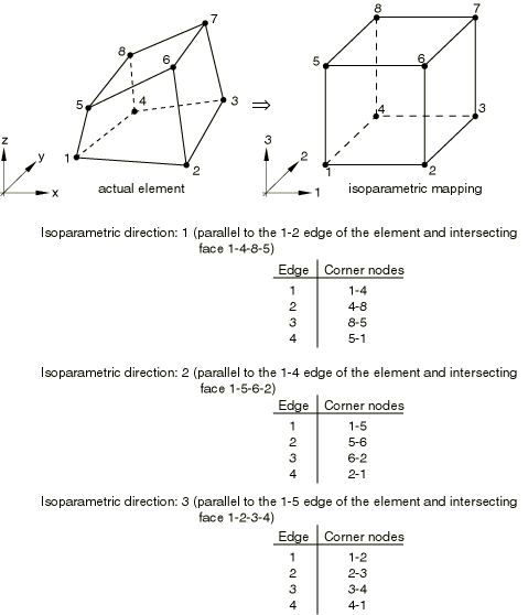 ![]() You specify the elements that contain the rebars; the cross-sectional area, A, of each rebar; and the fractional distances locating the rebar's position in the element, and . Input File Usage Use the following option to define single rebars in axisymmetric and generalized plane strain continuum elements: REBAR, ELEMENT=CONTINUUM, MATERIAL=mat, SINGLE Defining layers of rebars in three-dimensional continuum elementsBy default, the rebars in three-dimensional continuum elements are defined as layers lying in surfaces. The surfaces are most easily defined with respect to the isoparametric mapped cube of the element. Therefore, you must consider how the rebar will be defined before generating the mesh; if the rebar surfaces are not taken into account in designing the mesh, the rebar definition can be very inefficient. In the isoparametric mapped cube the rebar surface always has two edges (opposite to one another) that are parallel to an isoparametric direction. The isoparametric directions are defined in Figure 12. You specify this isoparametric direction (1, 2, or 3). Figure 12. Isoparametric direction and edge definitions for three-dimensional