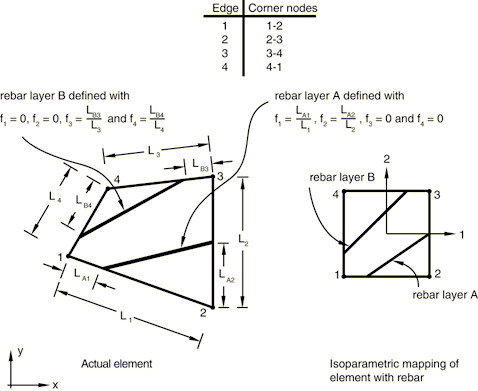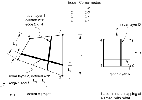 ![]() If an orientation angle other than 0 or 90° is specified for rebar in an axisymmetric element without twist, it is assumed that the rebar in the element are balanced (i.e., half the rebar lie at the specified angle and the other half at the angle ). Defining isoparametric rebarsFor isoparametric rebars the intersection of the rebar layer with the plane of the model will lie along the mapping of a constant isoparametric line in the element. You specify the elements that contain the rebars; the cross-sectional area, A, of each rebar; the rebar spacing, s; the rebar orientation, (as described above); the fractional distance from the edge, f (the ratio of the distance between the edge and the rebar to the distance across the element); and the edge number from which the rebars are defined. In addition, for axisymmetric elements you specify the radial position at which the rebar spacing is measured. If the radial position for the rebar spacing is given for rebar in axisymmetric elements, the total cross-sectional area of rebar will remain constant as the radial position changes; this behavior corresponds to the number of rebar remaining constant as r increases; that is, the thickness of the smeared layer of rebar decreases as r increases. If the radial position for the rebar spacing is omitted (or is set to zero), Abaqus assumes that the spacing of the rebar remains constant; the thickness of the corresponding smeared layer is held fixed such that . Figure 9 shows an example of isoparametric rebar. Figure 9. Isoparametric rebar layer definition in solid elements.