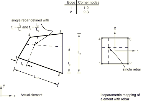 ![]() Figure 10 shows an example of skew rebar. In the isoparametric mapping of the element, the line of rebars intersects two of the element edges. The intersection points are located by defining a fractional distance along each intersected edge. In this figure rebar layer A is defined by the ratio along edge 1 and the ratio along edge 2. Rebar layer B is defined by the ratio along edge 3 and the ratio along edge 4. Defining skew rebars in continuum elements can increase the run time for an Abaqus/Explicit analysis significantly. The element's stable time increment will, in most cases, be determined by the stable time increment of the rebar, which is proportional to the rebar length. The rebar length is determined by factors including the rebar surface position in the element, the rebar spacing, the rebar area, and the rebar orientation within the rebar surface. If a skew rebar in a continuum element is defined such that it intersects two adjacent element edges, the resulting rebar length could be considerably less than the average element edge length, thus resulting in a very small element stable time increment. Input File Usage Use the following option to define layers of skew rebars in planar and axisymmetric continuum elements: REBAR, ELEMENT=CONTINUUM, MATERIAL=mat, GEOMETRY=SKEW Defining single rebars in two-dimensional axisymmetric and generalized plane strain continuum elementsYou can define single rebars in axisymmetric and generalized plane strain continuum elements. In this case the rebar is assumed to be at right angles with the plane of the model—in the thickness direction for generalized plane strain elements or the hoop direction for axisymmetric elements. The intersection of the rebar with the plane of the model is defined by the fractional distances along edges 1 and 2 of the intersections of constant isoparametric lines that pass through the rebar location (see Figure 11). The fractional distances are measured from the first edge node listed in Figure 11. Figure 11. Single rebar in a solid element.